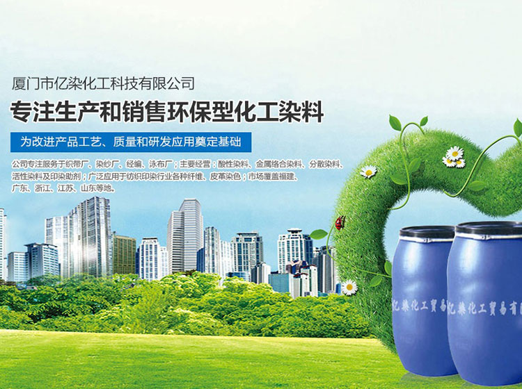 廈門市億染化工科技有限公司是一家集研發、生產、銷售一體的綜合型企業。公司主要經營:酸性染料、金屬絡合染料、高牢度分散染料及印染助劑。公司信守“以誠信贏合作、以質量贏市場、以創新贏發展、以服務贏生存”的企業精神服務于廣大客戶,多年以來建立了良好的市場口碑,市場遍布福建、廣東、浙江、江蘇、山東及東南亞國家,與多家知名企業建立了長期合作伙伴關系!